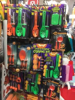 以前の記事で紹介しましたが、このランタン作りで使った小型ノコギリや大型スプーンは、ハロウィーンの「カービングキット」として、米国では雑貨屋などにこの時期、並んでいます。