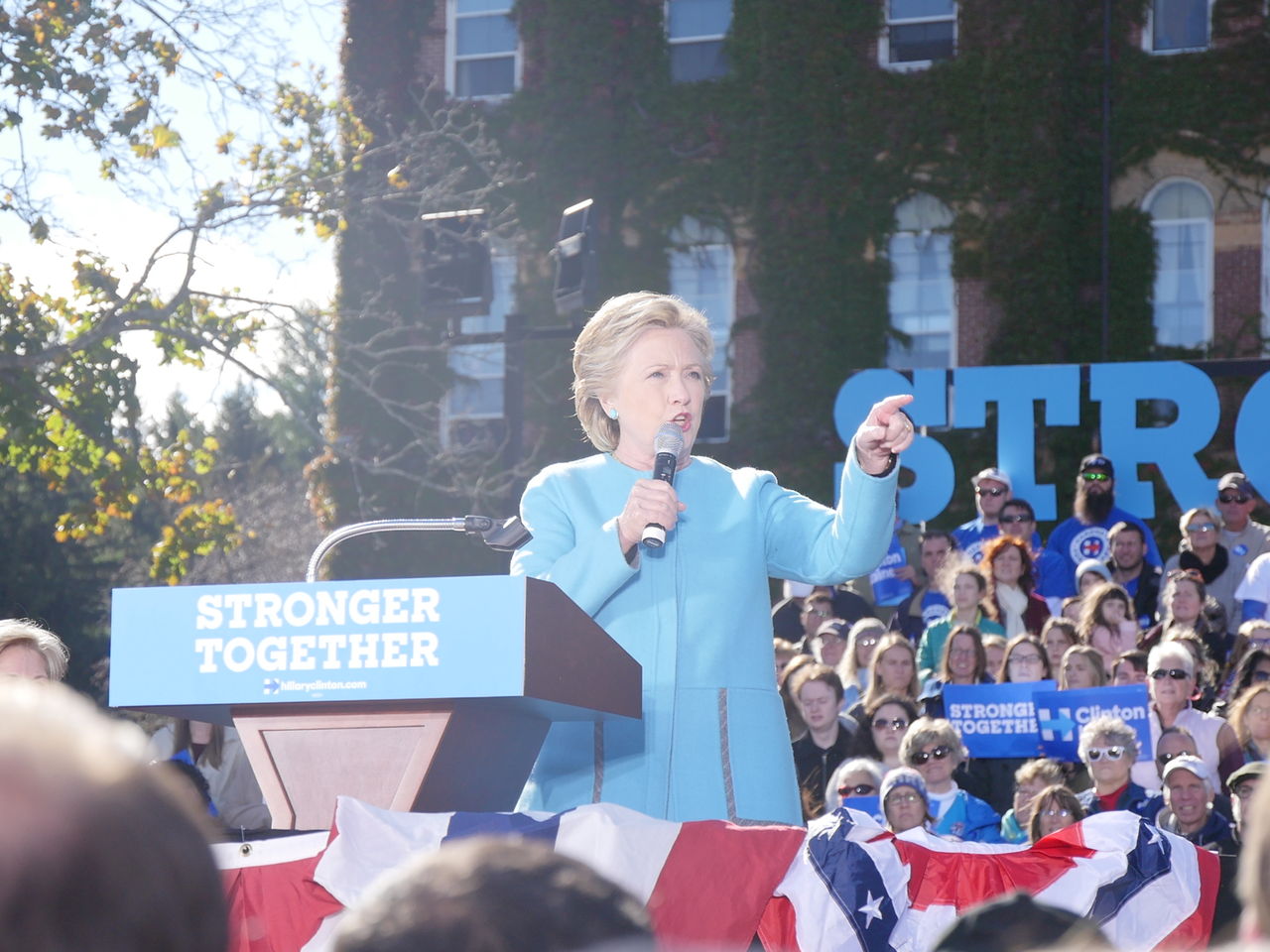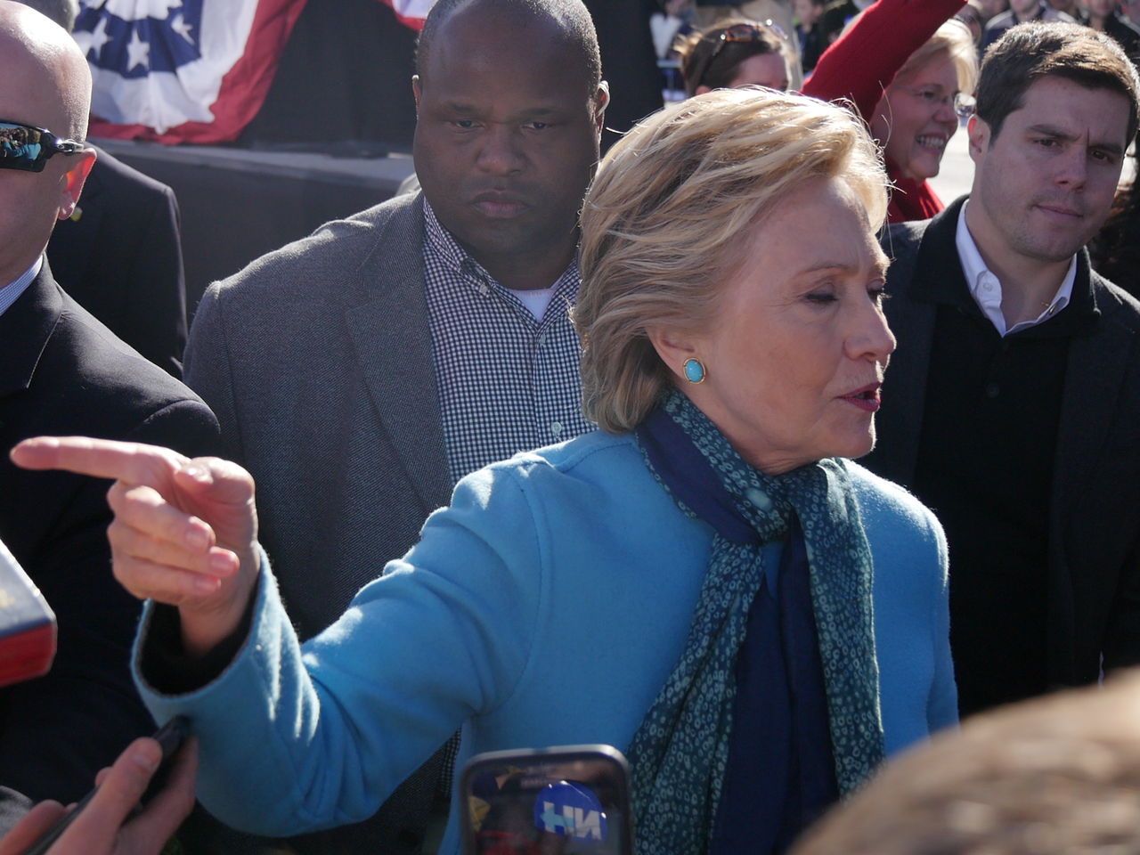 集会では、ヒラリーの作り笑いを